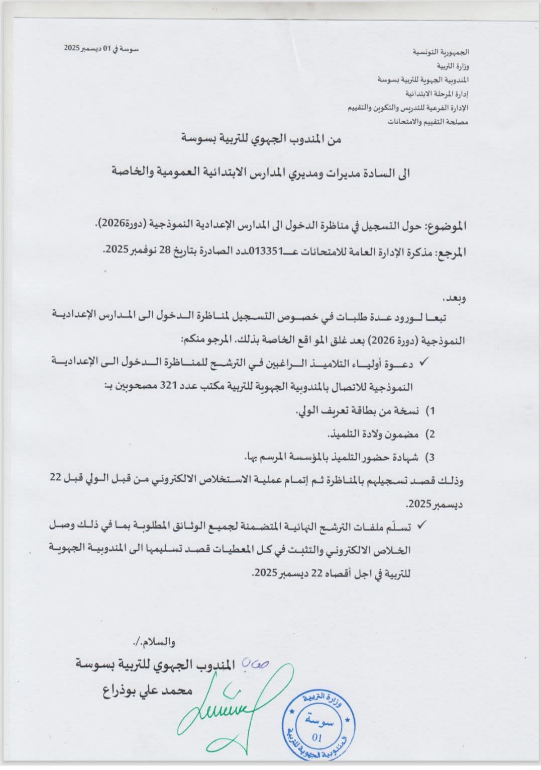 Tous les élèves classés parmi les premiers et ayant le droit de se présenter au Concours des Collèges Pilotes 2026 sont invités à prendre contact immédiatement avec la Délégation Régionale de l’Éducation (Commissariat Régional) de leur gouvernorat respectif pour entamer les démarches nécessaires.